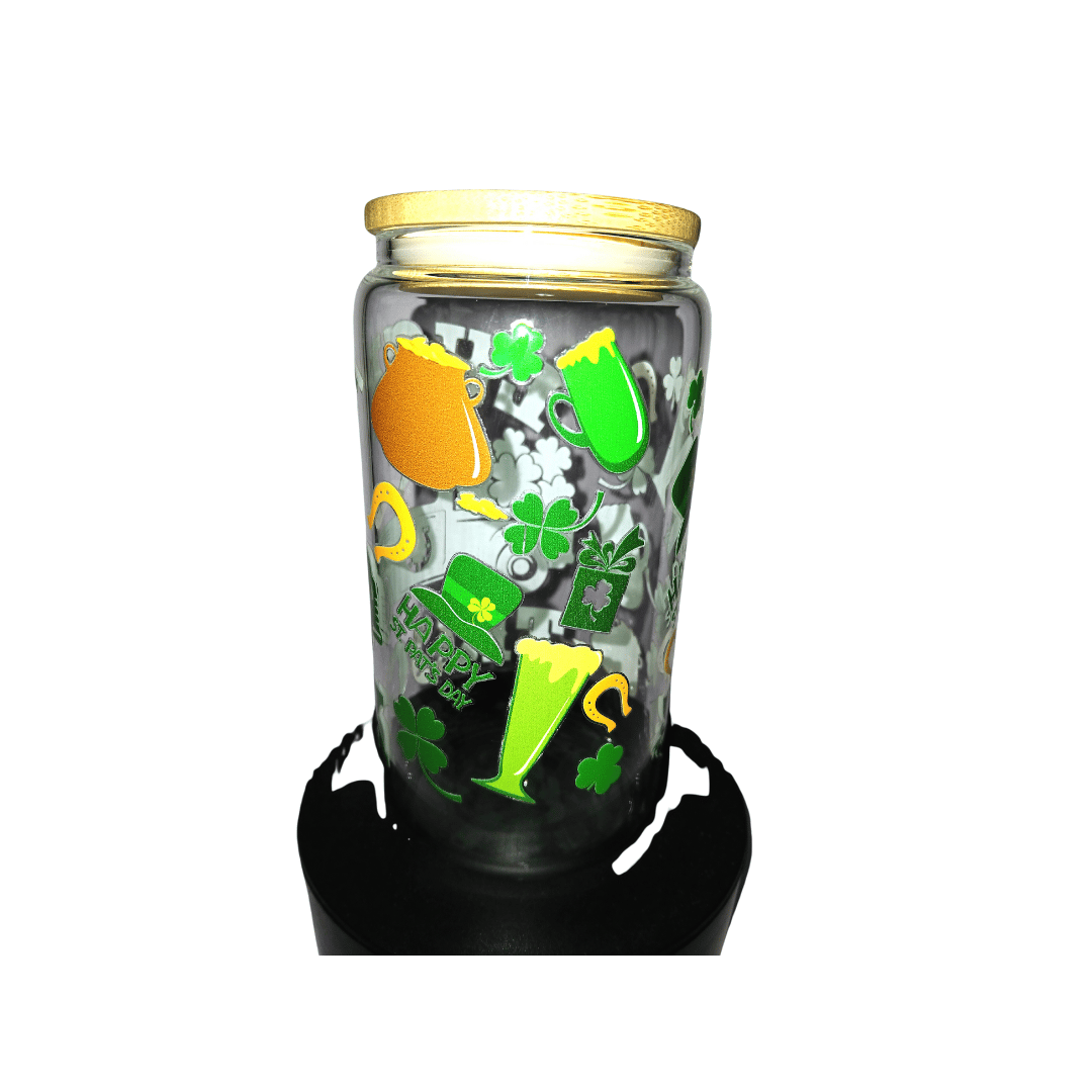 Celebrate the luck of the Irish with this glass cup that comes with a lid and straw. It is perfect for your iced coffee, Frappuccino, or iced drink.
